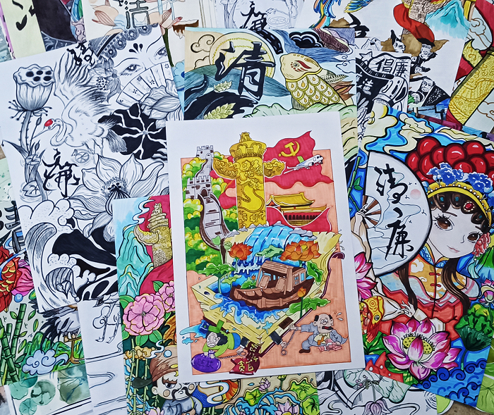 此次“廉洁”主题作品设计大赛,同学们积极响应,踊跃报名投稿,共收到作品百余幅。经专业老师评选后,选出一等奖5名、二等奖10名、三等奖15名。员工创作的作品富有特色,不仅展现了师范学子的风采,更表达了青年学子积极践行“清廉”的决心。相关书画作品将以公众号推文的形式展出。