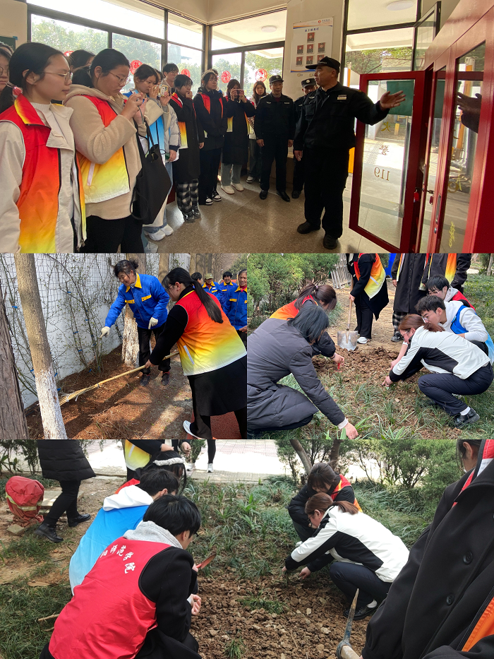 “体验劳动者的一天”活动中,志愿者们走进身边“劳动者小课堂”,分成三组,分别跟随保安叔叔、保洁阿姨和宿管阿姨,体验他们一天的主要工作。安保岗位上,志愿者们跟随安保人员打卡校园巡逻点,学习消防常用器材及日常急救工具的使用方法,感受到了责任与担当;保洁岗位上,志愿者们用扫帚和铁耙清扫草坪和难清理的藤蔓、落叶等,并在物业老师的指导下完成除草、浇水、翻地等工作,体会到了艰辛与不易;宿管岗位上,志愿者们通过倾听交流、亲身体验的方式,深入理解宿管老师的工作,学会了如何更好地服务同学。